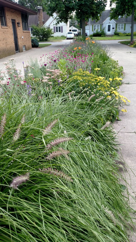 This strip was always difficult to water as I have no irrigation system, and I had been wanting to convert more grass to other plant materials to benefit wildlife. I had the sod removed and grade lowered, so water (rain) run-off will go into the garden instead of the storm drain.