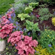 Colorful ‘Georgia Peach’ Heuchera with grape hyacinth, creeping jenny, corydalis, hostas.